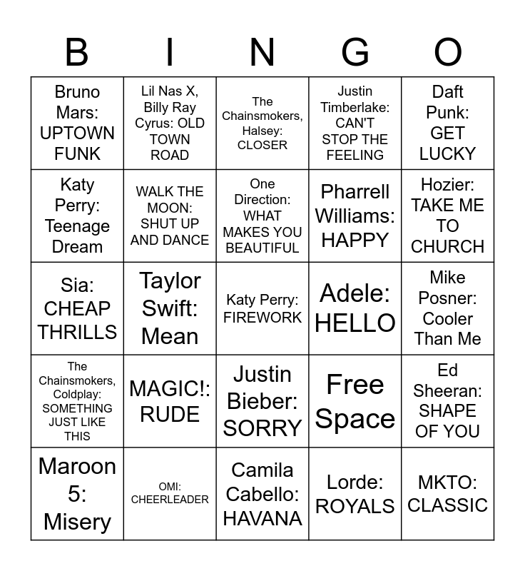 This bingo card has 25 words: MAGIC!: RUDE, Camila Cabello: HAVANA, One Direction: WHAT MAKES YOU BEAUTIFUL, Maroon 5: Misery, Daft Punk: GET LUCKY, Bruno Mars: UPTOWN FUNK, Katy Perry: Teenage Dream, Lil Nas X, Billy Ray Cyrus: OLD TOWN ROAD, Adele: HELLO, Justin Bieber: SORRY, Pharrell Williams: HAPPY, Sia: CHEAP THRILLS, Free Space, Ed Sheeran: SHAPE OF YOU, WALK THE MOON: SHUT UP AND DANCE, MKTO: CLASSIC, Mike Posner: Cooler Than Me, The Chainsmokers, Halsey: CLOSER, Hozier: TAKE ME TO CHURCH, Taylor Swift: Mean, Katy Perry: FIREWORK, OMI: CHEERLEADER, The Chainsmokers, Coldplay: SOMETHING JUST LIKE THIS, Justin Timberlake: CAN'T STOP THE FEELING and Lorde: ROYALS.