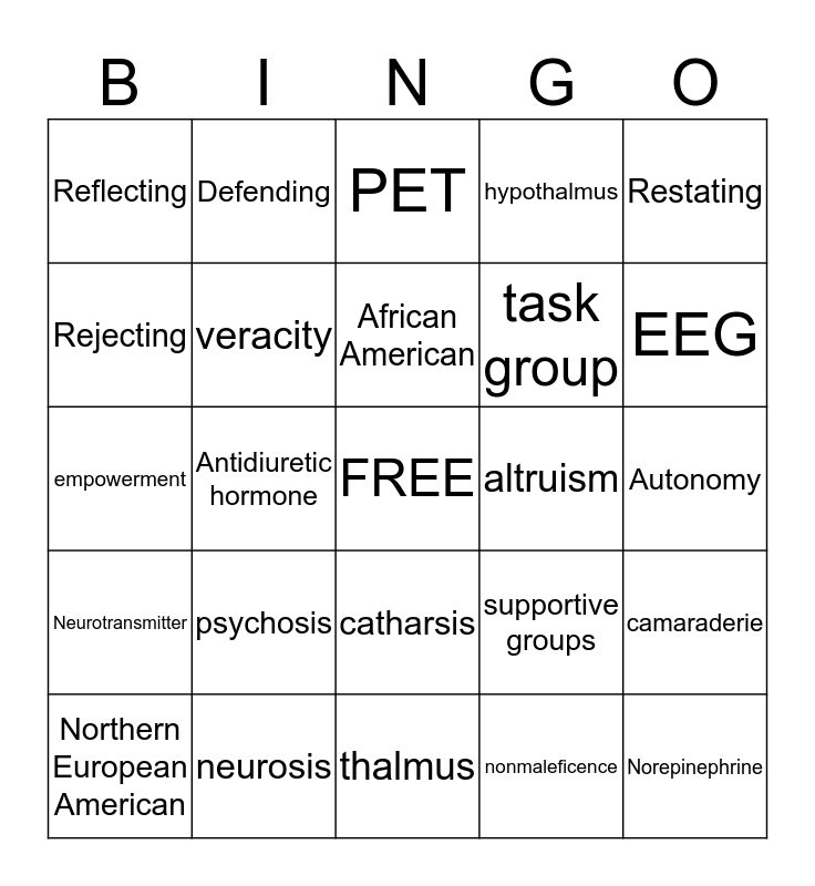 This bingo card has a free space and 24 words: psychosis, neurosis, African American, Northern European American, Restating, Reflecting, Rejecting, Defending, altruism, catharsis, task group, empowerment, supportive groups, camaraderie, veracity, nonmaleficence, Autonomy, PET, EEG, Antidiuretic hormone, Norepinephrine, Neurotransmitter, hypothalmus and thalmus.