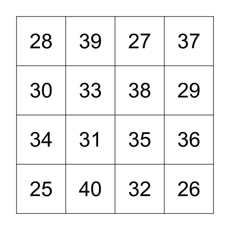 This bingo card has a free space and 15 words: 25, 26, 27, 28, 29, 30, 31, 32, 33, 34, 36, 37, 38, 39 and 40.