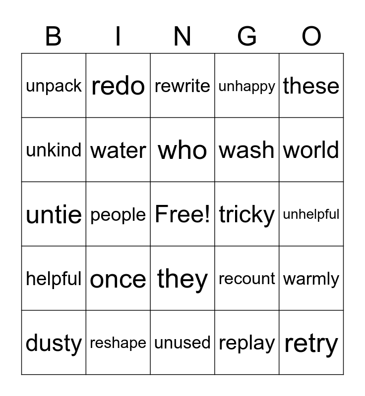 This bingo card has a free space and 24 words: once, reshape, who, dusty, these, unpack, unkind, redo, tricky, they, wash, untie, recount, warmly, water, replay, unhelpful, rewrite, world, people, retry, helpful, unhappy and unused.