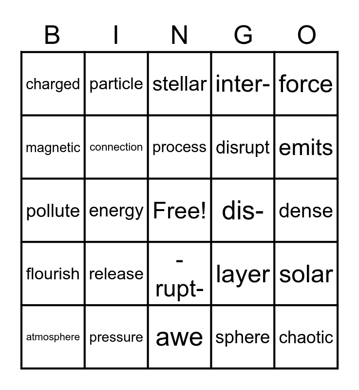This bingo card has a free space and 24 words: release, pressure, process, atmosphere, force, charged, magnetic, particle, dis-, -rupt-, disrupt, pollute, layer, solar, connection, sphere, dense, stellar, emits, energy, chaotic, flourish, inter- and awe.