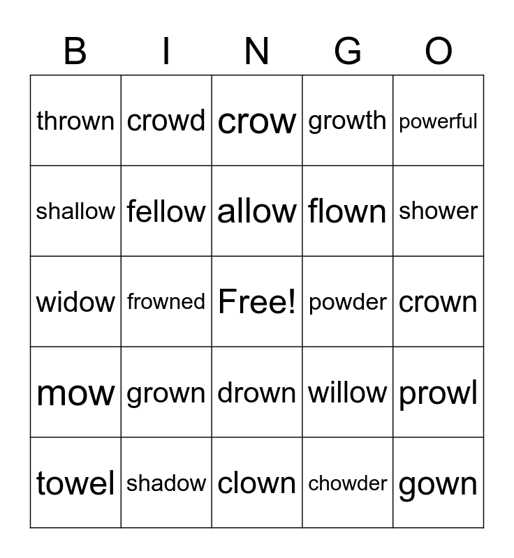 This bingo card has a free space and 24 words: grown, shadow, allow, towel, powerful, thrown, shallow, crowd, powder, drown, flown, widow, willow, prowl, fellow, chowder, crown, crow, shower, frowned, gown, mow, growth and clown.