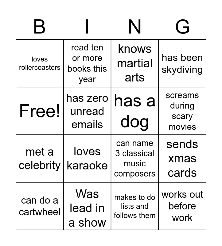 This bingo card has 16 words: Was lead in a show, sends xmas cards, knows martial arts, loves rollercoasters, met a celebrity, read ten or more books this year, can name 3 classical music composers, makes to do lists and follows them, Free!, has zero unread emails, can do a cartwheel, has been skydiving, loves karaoke, screams during scary movies, has a dog and works out before work.