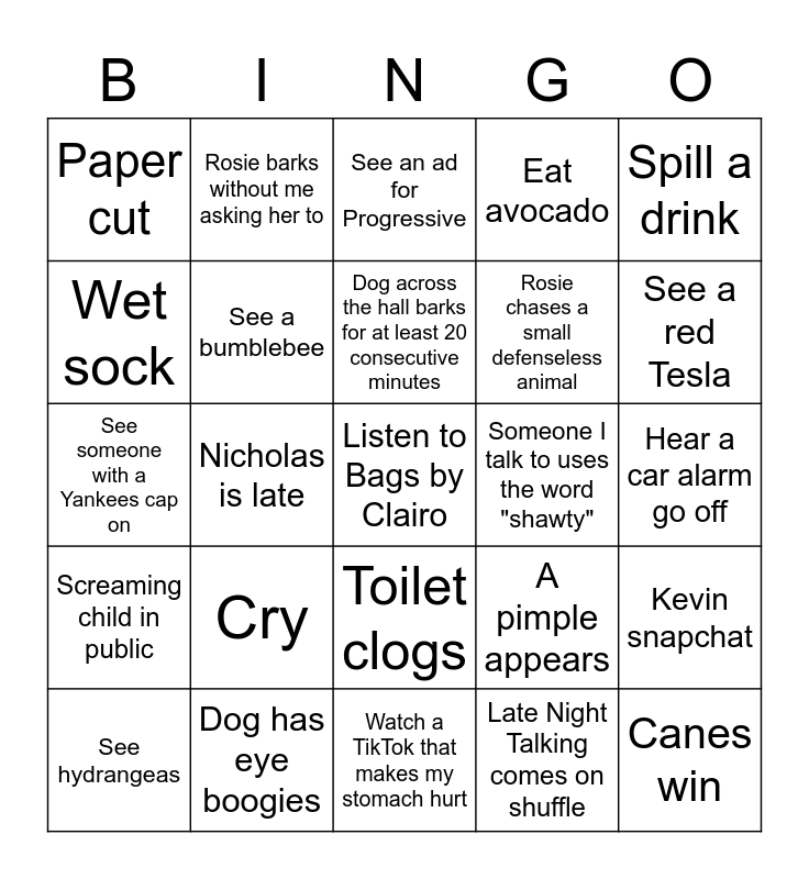 This bingo card has a free space and 24 words: Cry, Dog has eye boogies, Dog across the hall barks for at least 20 consecutive minutes, See hydrangeas, Spill a drink, Paper cut, Wet sock, Rosie barks without me asking her to, Someone I talk to uses the word "shawty", Toilet clogs, Rosie chases a small defenseless animal, See someone with a Yankees cap on, A pimple appears, Kevin snapchat, See a bumblebee, Late Night Talking comes on shuffle, Hear a car alarm go off, See an ad for Progressive, See a red Tesla, Nicholas is late, Canes win, Screaming child in public, Eat avocado and Watch a TikTok that makes my stomach hurt.