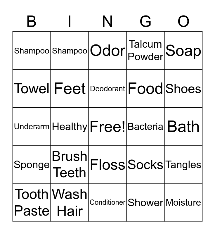 This bingo card has a free space and 24 words: Brush Teeth, Wash Hair, Deodorant, Tooth Paste, Soap, Shampoo, Towel, Shampoo, Bacteria, Floss, Food, Underarm, Socks, Tangles, Feet, Shower, Bath, Odor, Shoes, Healthy, Moisture, Sponge, Talcum Powder and Conditioner.