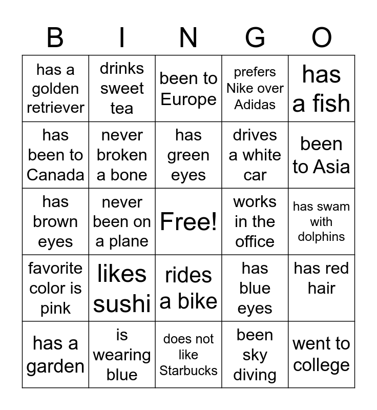 This bingo card has a free space and 24 words: likes sushi, is wearing blue, has green eyes, has a garden, has a fish, has a golden retriever, has been to Canada, drinks sweet tea, works in the office, rides a bike, drives a white car, has brown eyes, has blue eyes, has red hair, never broken a bone, been sky diving, has swam with dolphins, been to Europe, been to Asia, never been on a plane, went to college, favorite color is pink, prefers Nike over Adidas and does not like Starbucks.