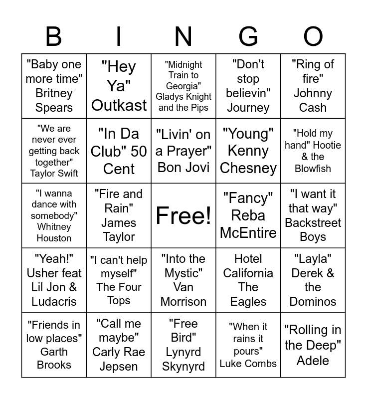 This bingo card has a free space and 24 words: "I can't help myself" The Four Tops, "Call me maybe" Carly Rae Jepsen, "Livin' on a Prayer" Bon Jovi, "Friends in low places" Garth Brooks, "Ring of fire" Johnny Cash, "Baby one more time" Britney Spears, "We are never ever getting back together" Taylor Swift, "Hey Ya" Outkast, "Fancy" Reba McEntire, "Into the Mystic" Van Morrison, "Young" Kenny Chesney, "I wanna dance with somebody" Whitney Houston, Hotel California The Eagles, "Layla" Derek & the Dominos, "In Da Club" 50 Cent, "When it rains it pours" Luke Combs, "I want it that way" Backstreet Boys, "Midnight Train to Georgia" Gladys Knight and the Pips, "Hold my hand" Hootie & the Blowfish, "Fire and Rain" James Taylor, "Rolling in the Deep" Adele, "Yeah!" Usher feat Lil Jon & Ludacris, "Don't stop believin" Journey and "Free Bird" Lynyrd Skynyrd.