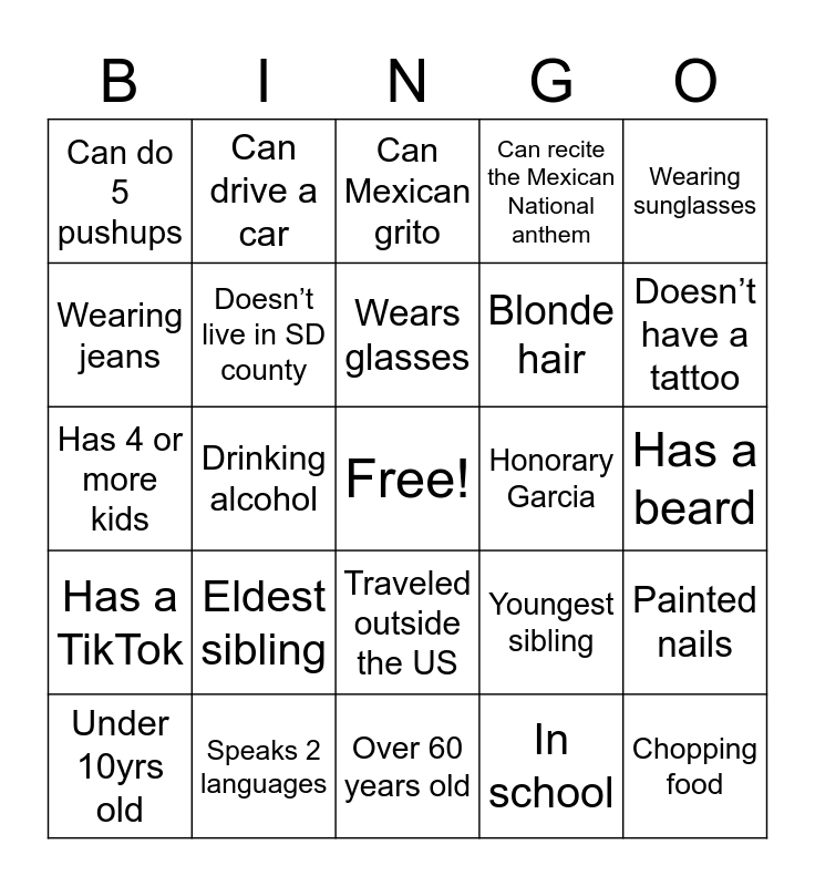 This bingo card has a free space and 29 words: Under 10yrs old, Doesn’t have kids, Drinking alcohol, On the grill, Can do 5 pushups, Can Mexican grito, Doesn’t live in SD county, Eldest sibling, Honorary Garcia, Speaks 2 languages, Has a beard, Chopping food, Over 60 years old, In school, Doesn’t have a tattoo, Can whistle, Traveled outside the US, Has a TikTok, Wearing sunglasses, Has 4 or more kids, Youngest sibling, Wearing a hat, Blonde hair, Wearing jeans, Can recite the Mexican National anthem, Can drive a car, Painted nails, Wears glasses and Married.