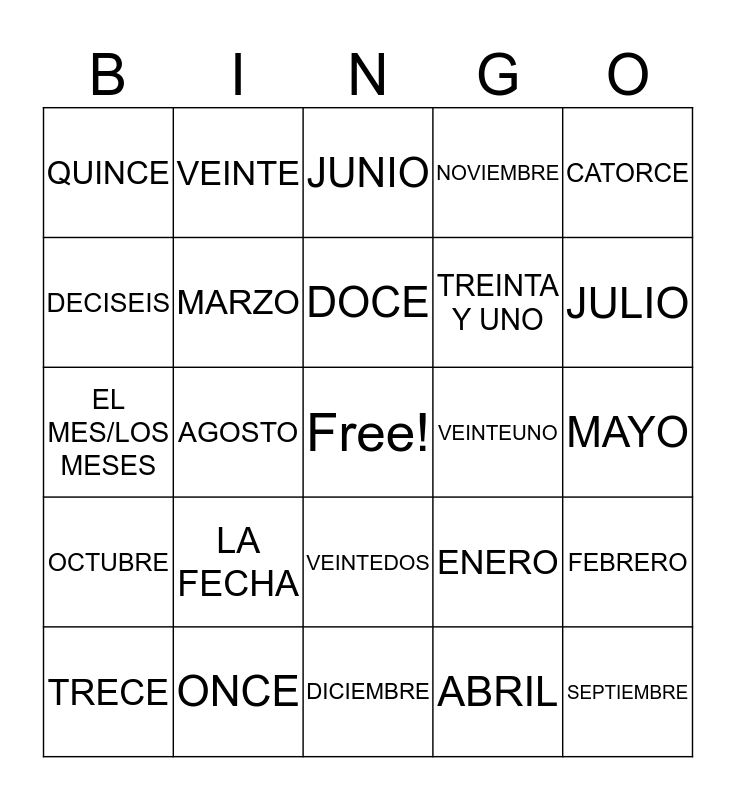 This bingo card has a free space and 24 words: LA FECHA, ONCE, DOCE, TRECE, CATORCE, QUINCE, DECISEIS, VEINTE, VEINTEUNO, VEINTEDOS, TREINTA Y UNO, EL MES/LOS MESES, ENERO, FEBRERO, MARZO, ABRIL, MAYO, JUNIO, JULIO, AGOSTO, SEPTIEMBRE, OCTUBRE, NOVIEMBRE and DICIEMBRE.