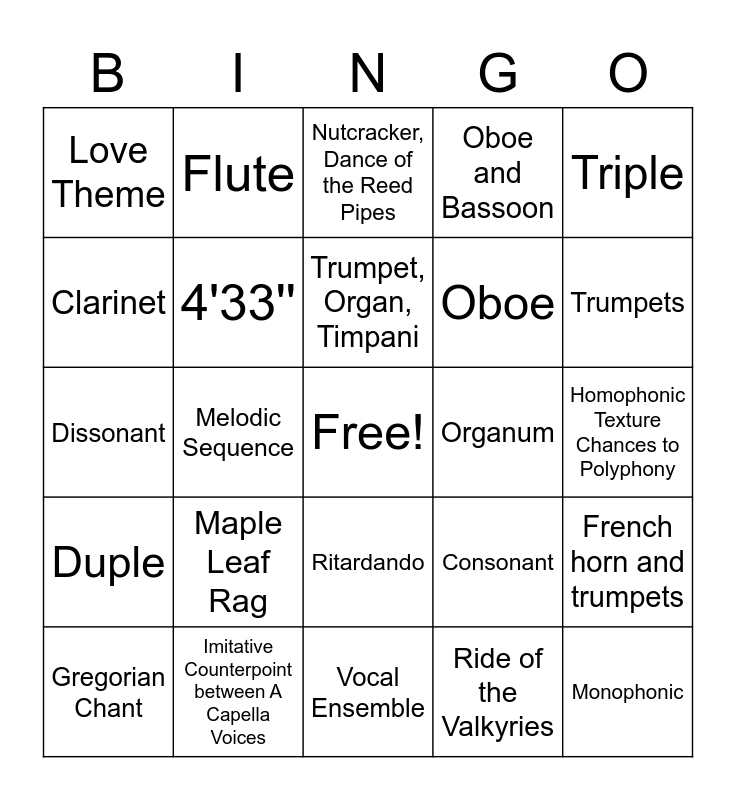 This bingo card has a free space and 29 words: Gregorian Chant, A cappella/ Homophonic, Melodic Sequence, Wild Ride on Horseback, Love Theme, Nutcracker, Dance of the Reed Pipes, 4'33'', Maple Leaf Rag, Organum, Imitative Counterpoint between A Capella Voices, Homophonic Texture Chances to Polyphony, Monophonic, Vocal Ensemble, Ride of the Valkyries, Trumpets, Motive, Ritardando, Duple, Triple, Dissonant, Consonant, Flute, Cello, Clarinet, Oboe, Clarinet, Oboe and Bassoon, Flute, French horn and trumpets, Trumpet, Organ, Timpani and Violin and Flute.
