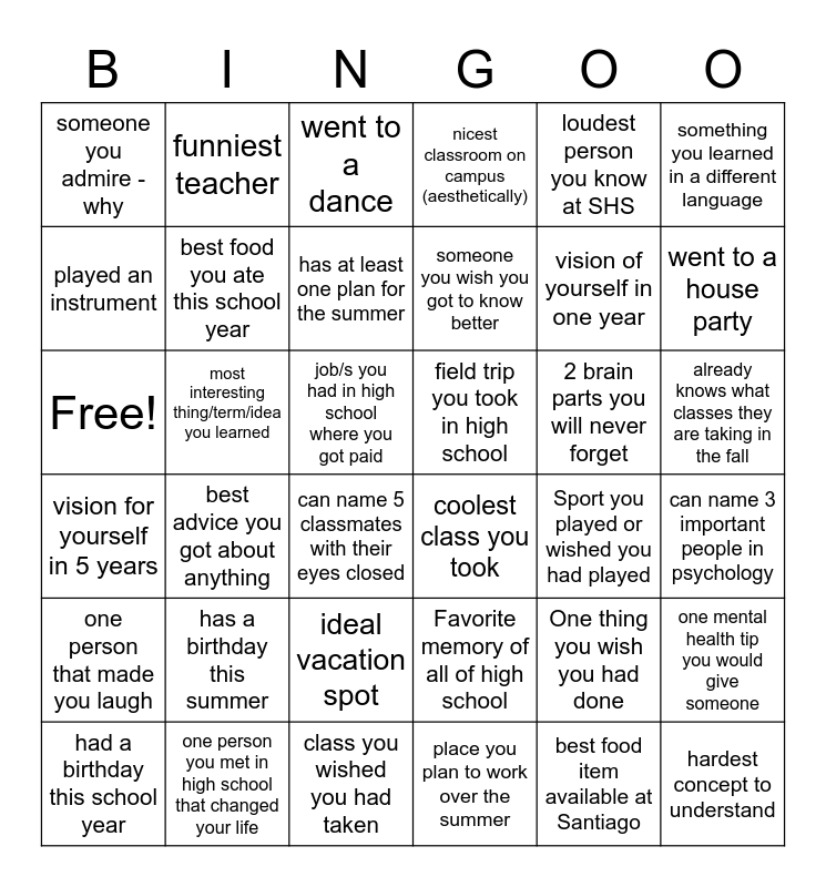 This bingo card has 36 words: Favorite memory of all of high school, ideal vacation spot, place you plan to work over the summer, played an instrument, vision for yourself in 5 years, field trip you took in high school, best food you ate this school year, class you wished you had taken, loudest person you know at SHS, One thing you wish you had done, went to a house party, nicest classroom on campus (aesthetically), one mental health tip you would give someone, most interesting thing/term/idea you learned, someone you wish you got to know better, someone you admire - why, one person that made you laugh, 2 brain parts you will never forget, Free!, went to a dance, job/s you had in high school where you got paid, best advice you got about anything, coolest class you took, can name 5 classmates with their eyes closed, Sport you played or wished you had played, funniest teacher, vision of yourself in one year, one person you met in high school that changed your life, has at least one plan for the summer, something you learned in a different language, hardest concept to understand, had a birthday this school year, can name 3 important people in psychology, already knows what classes they are taking in the fall, has a birthday this summer and best food item available at Santiago.