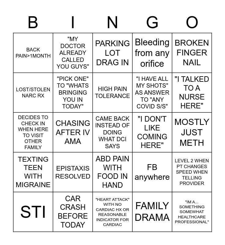 This bingo card has 25 words: EPISTAXIS RESOLVED, "HEART ATTACK" WITH NO CARDIAC HX OR REASONABLE INDICATOR FOR CARDIAC, HIGH PAIN TOLERANCE, STI, BROKEN FINGER NAIL, BACK PAIN>1MONTH, LOST/STOLEN NARC RX, "MY DOCTOR ALREADY CALLED YOU GUYS", "I DON'T LIKE COMING HERE", ABD PAIN WITH FOOD IN HAND, "I HAVE ALL MY SHOTS" AS ANSWER TO "ANY COVID S/S", DECIDES TO CHECK IN WHEN HERE TO VISIT OTHER FAMILY, FB anywhere, LEVEL 2 WHEN PT CHANGES SPEED WHEN TELLING PROVIDER, "PICK ONE" TO "WHATS BRINGING YOU IN TODAY", "IM A... SOMETHING SOMEWHAT HEALTHCARE PROFESSIONAL", MOSTLY JUST METH, PARKING LOT DRAG IN, "I TALKED TO A NURSE HERE", CHASING AFTER IV AMA, CAME BACK INSTEAD OF DOING WHAT DCI SAYS, CAR CRASH BEFORE TODAY, TEXTING TEEN WITH MIGRAINE, Bleeding from any orifice and FAMILY DRAMA.