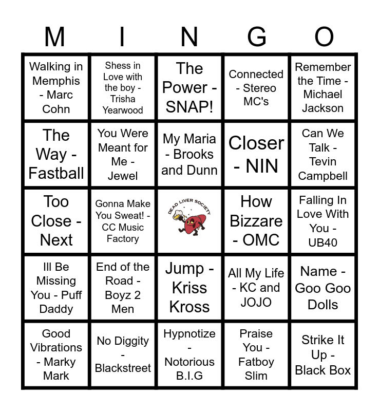 This bingo card has a free space and 30 words: No Diggity - Blackstreet, Say My Name - Destiny's Child, Gonna Make You Sweat! - CC Music Factory, That's The Way Love Goes - Janet Jackson, Walking in Memphis - Marc Cohn, The Power - SNAP!, You Were Meant for Me - Jewel, Jump - Kriss Kross, How Bizzare - OMC, Hypnotize - Notorious B.I.G, Falling In Love With You - UB40, Strike It Up - Black Box, Praise You - Fatboy Slim, Come Undone - Duran Duran, Can We Talk - Tevin Campbell, Don't Walk Away - Jade, All My Life - KC and JOJO, Ill Be Missing You - Puff Daddy, End of the Road - Boyz 2 Men, Remember the Time - Michael Jackson, Too Close - Next, Check Yes or No - George Strait, Shess in Love with the boy - Trisha Yearwood, Closer - NIN, The Way - Fastball, Connected - Stereo MC's, Name - Goo Goo Dolls, Good Vibrations - Marky Mark, My Maria - Brooks and Dunn and California Love - 2PAC.