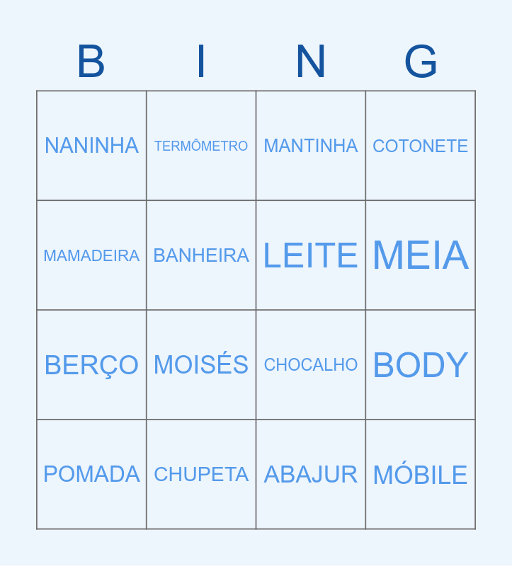 This bingo card has 20 words: BODY, TROCADOR, MANTINHA, FRALDA, POMADA, MAMADEIRA, CHUPETA, NANINHA, BERÇO, TERMÔMETRO, MOISÉS, CHOCALHO, BANHEIRA, MÓBILE, LEITE, BABADOR, MEIA, COTONETE, ABAJUR and CARRINHO.