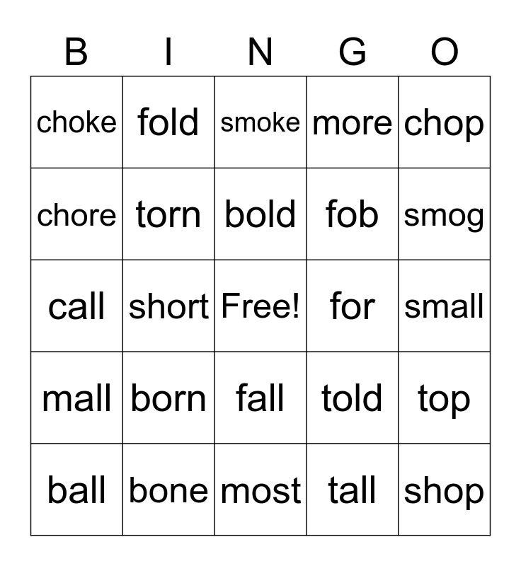 This bingo card has a free space and 24 words: born, bone, bold, ball, chop, choke, chore, fold, for, fall, fob, call, told, top, torn, tall, small, smoke, smog, short, shop, mall, more and most.