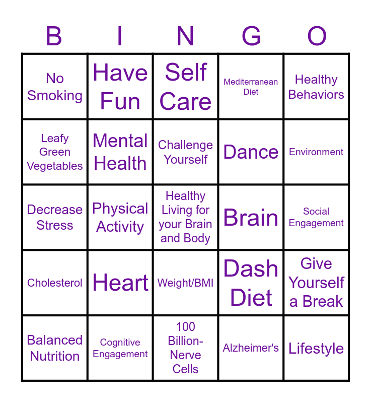 This bingo card has a free space and 29 words: Balanced Nutrition, Fruits and Vegetables, Physical Activity, Sleep, No Smoking, Self Care, Mental Health, Heart, Brain, Cognitive Engagement, Social Engagement, Lifestyle, 100 Billion-Nerve Cells, Alzheimer's, Environment, Blood Pressure, Weight/BMI, Cholesterol, Healthy Behaviors, Decrease Stress, Dash Diet, Volunteer, Dance, Leafy Green Vegetables, Mediterranean Diet, Have Fun, Give Yourself a Break, Challenge Yourself and Heart and Brain Conection.