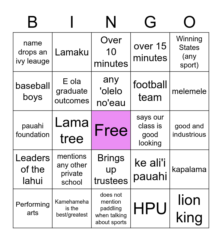 This bingo card has a free space and 33 words: AA Degree, Po'o Kula Scholarship, Lama tree, Koa Trees, Leaders of the lahui, E ola graduate outcomes, Winning States (any sport), Performing arts, Lamaku, Lahui, any 'olelo no'eau, Over 10 minutes, Aloha x2, Mentions he is an allumi, says our class is good looking, melemele, Kamehameha is the best/greatest, pauahi foundation, mentions any other private school, ke ali'i pauahi, Brings up trustees, pidgin/slang, name drops an ivy leauge, good and industrious, does not mention paddling when talking about sports, lion king, over 15 minutes, football team, baseball boys, kapalama, ke akua, HPU and thanks the trustees.