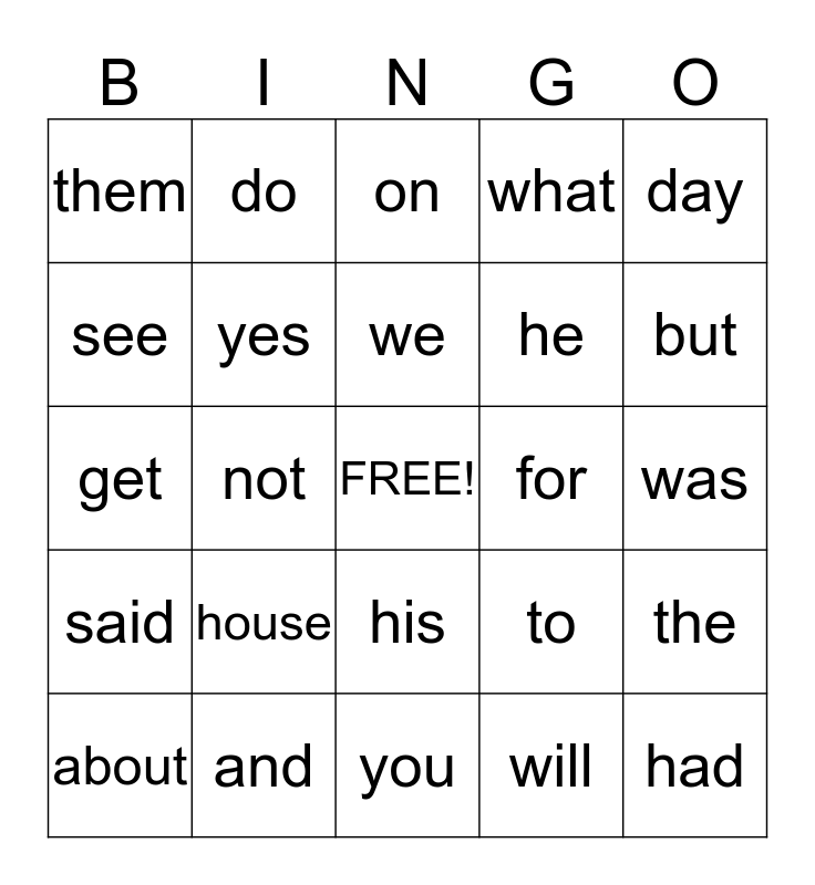 This bingo card has a free space and 24 words: house, and, we, about, day, them, see, do, for, his, he, get, to, the, yes, will, was, on, but, not, had, said, what and you.