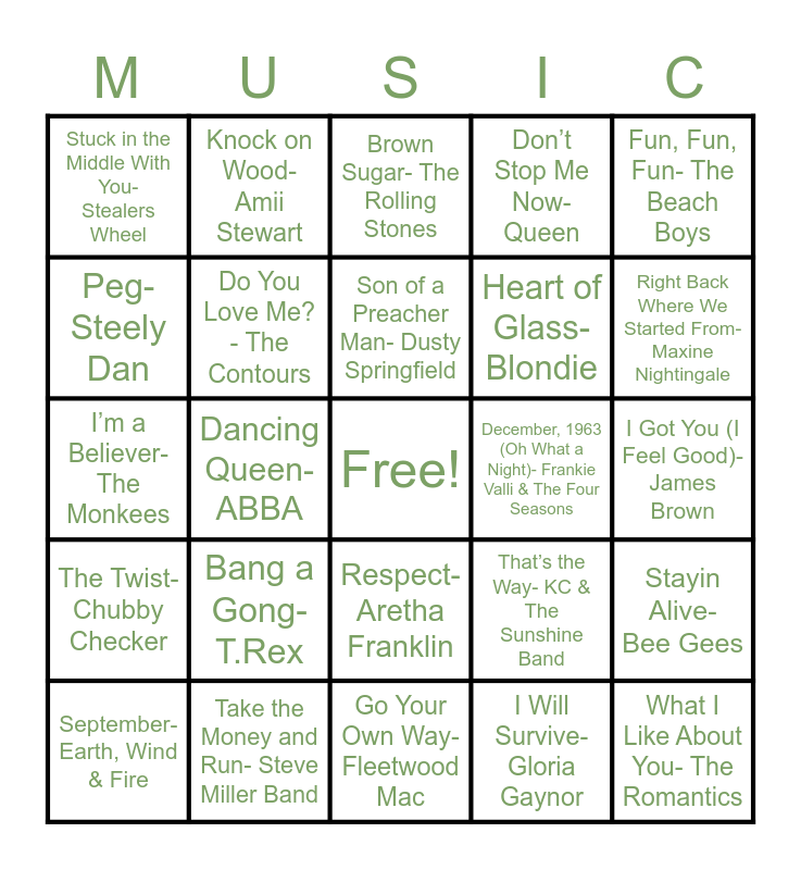 This bingo card has a free space and 41 words: Twist and Shout- The Beatles, I’m a Believer- The Monkees, Ain’t Too Proud to Beg- The Temptations, Do You Love Me? - The Contours, Take the Money and Run- Steve Miller Band, Respect- Aretha Franklin, Son of a Preacher Man- Dusty Springfield, Tequila- The Champs, Fun, Fun, Fun- The Beach Boys, The Twist- Chubby Checker, Dancing Queen- ABBA, Don’t Stop Me Now- Queen, What I Like About You- The Romantics, I Got You (I Feel Good)- James Brown, December, 1963 (Oh What a Night)- Frankie Valli & The Four Seasons, Bang a Gong- T.Rex, Disco Inferno- The Trammps, Stuck in the Middle With You- Stealers Wheel, Boogie Shoes- KC & The Sunshine Band, Brown Sugar- The Rolling Stones, Stayin Alive- Bee Gees, Celebration- Kool & The Gang, Go Your Own Way- Fleetwood Mac, Heart of Glass- Blondie, We Are Family- Sister Sledge, Wake Me Up Before You Go-Go Wham!, I Will Survive- Gloria Gaynor, Copacabana- Barry Manilow, Right Back Where We Started From- Maxine Nightingale, Le Freak- CHIC, Hot Stuff- Donna Summer, Knock on Wood- Amii Stewart, September- Earth, Wind & Fire, Signed, Sealed, Delivered- Stevie Wonder, That’s the Way- KC & The Sunshine Band, Peg- Steely Dan, I Want You Back- Jackson 5, Play That Funky Music- Wild Cherry, Saturday Night’s Alright- Elton John, One Way or Another- Blondie and Higher- Jackie Wilson.