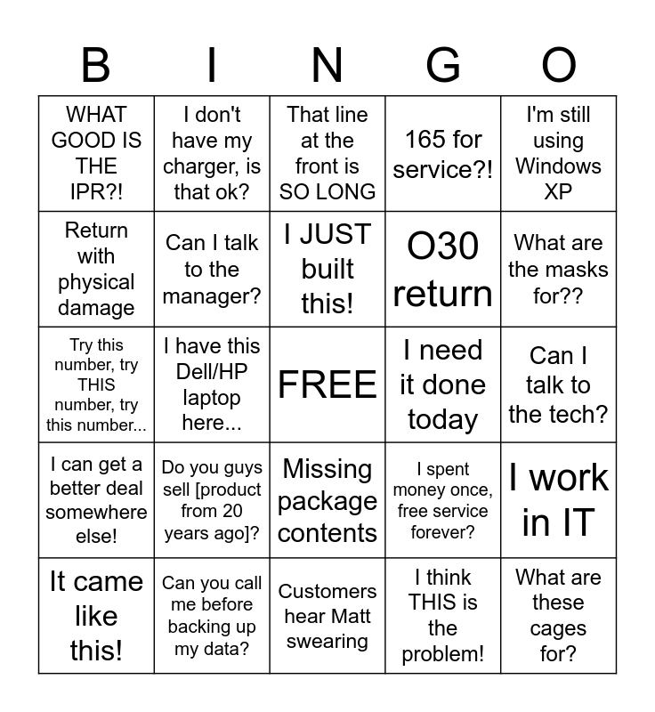 This bingo card has a free space and 24 words: Do you guys sell [product from 20 years ago]?, Can you call me before backing up my data?, I JUST built this!, It came like this!, I'm still using Windows XP, WHAT GOOD IS THE IPR?!, Return with physical damage, I don't have my charger, is that ok?, I need it done today, Missing package contents, O30 return, Try this number, try THIS number, try this number..., I spent money once, free service forever?, I work in IT, Can I talk to the manager?, I think THIS is the problem!, Can I talk to the tech?, That line at the front is SO LONG, What are the masks for??, I have this Dell/HP laptop here..., What are these cages for?, I can get a better deal somewhere else!, 165 for service?! and Customers hear Matt swearing.