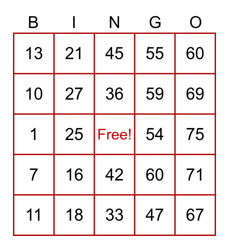 This bingo card has a free space and 24 words: 11, 16, 36, 47, 60, 13, 21, 45, 54, 75, 1, 27, 60, 71, 10, 18, 33, 55, 69, 7, 25, 42, 59 and 67.