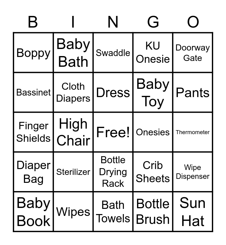 This bingo card has a free space and 36 words: Car Mirror, Car Seat, Car Seat Base, Cloth Diapers, Crib Sheets, Diaper Bag, Dress, Footie Sleeper, Doorway Gate, Headbands, High Chair, KU Onesie, Nail Scissors, Onesies, Pants, Boppy, Sound Machine, Sterilizer, Sun Hat, Swaddle, Thermometer, Wipe Dispenser, Wipes, Baby Book, Bath Towels, Baby Bath, Finger Shields, Baby Carrier, Baby Toy, Bassinet, Bath Soap, Blanket, Bottle Brush, Bottle Drying Rack, 4 Oz Bottles and 8 Oz Bottles.