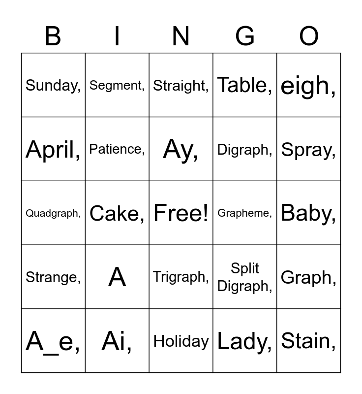 This bingo card has a free space and 24 words: A, Ai,, Ay,, A_e,, eigh,, Sunday,, April,, Segment,, Grapheme,, Trigraph,, Digraph,, Quadgraph,, Split Digraph,, Graph,, Patience,, Lady,, Baby,, Straight,, Spray,, Cake,, Stain,, Strange,, Table, and Holiday.