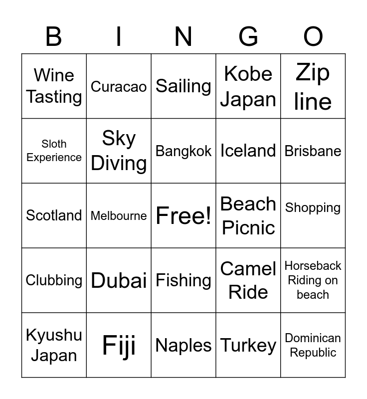 This bingo card has a free space and 28 words: Horseback Riding on beach, Hawaii, Iceland, Turkey, Sloth Experience, Sailing, Curacao, Clubbing, Beach Picnic, Kyushu Japan, Scotland, Kobe Japan, Fiji, Naples, Brisbane, Desert Safari, Dubai, Sky Diving, Bangkok, Fishing, Wine Tasting, Nassau, Dominican Republic, Melbourne, Shopping, Camel Ride, Zip line and Palace Of Versailles.