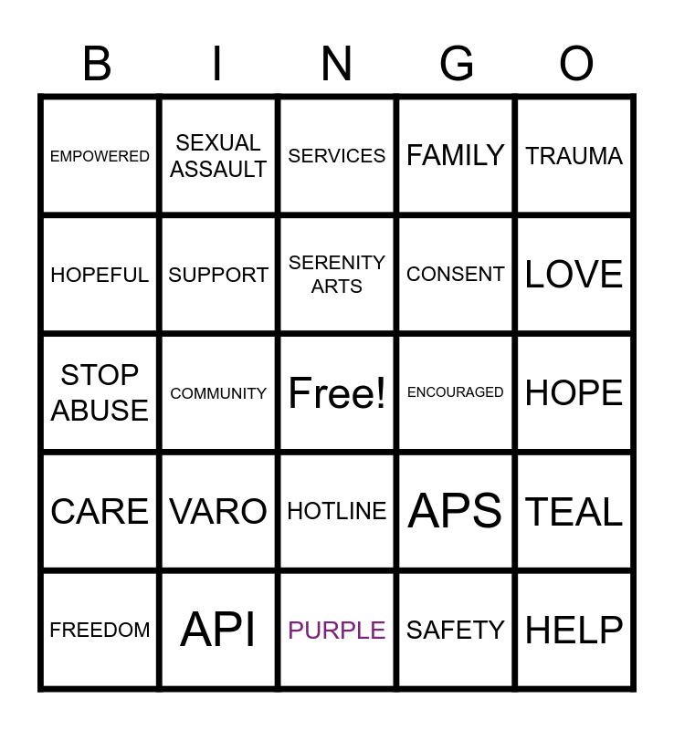 This bingo card has a free space and 24 words: VARO, API, SERENITY ARTS, FREEDOM, TRAUMA, EMPOWERED, HOPEFUL, SEXUAL ASSAULT, ENCOURAGED, HOTLINE, CONSENT, STOP ABUSE, APS, TEAL, SUPPORT, SAFETY, HOPE, SERVICES, LOVE, COMMUNITY, HELP, CARE, FAMILY and PURPLE.