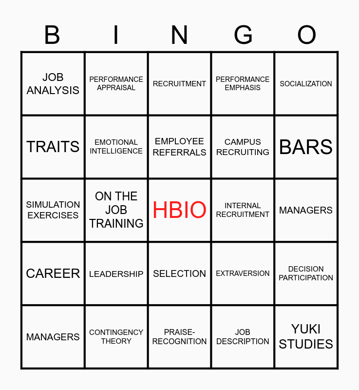 This bingo card has a free space and 24 words: LEADERSHIP, CONTINGENCY THEORY, EMPLOYEE REFERRALS, MANAGERS, SOCIALIZATION, JOB ANALYSIS, TRAITS, PERFORMANCE APPRAISAL, INTERNAL RECRUITMENT, SELECTION, CAMPUS RECRUITING, SIMULATION EXERCISES, EXTRAVERSION, DECISION PARTICIPATION, EMOTIONAL INTELLIGENCE, JOB DESCRIPTION, MANAGERS, RECRUITMENT, BARS, ON THE JOB TRAINING, YUKI STUDIES, CAREER, PERFORMANCE EMPHASIS and PRAISE-RECOGNITION.