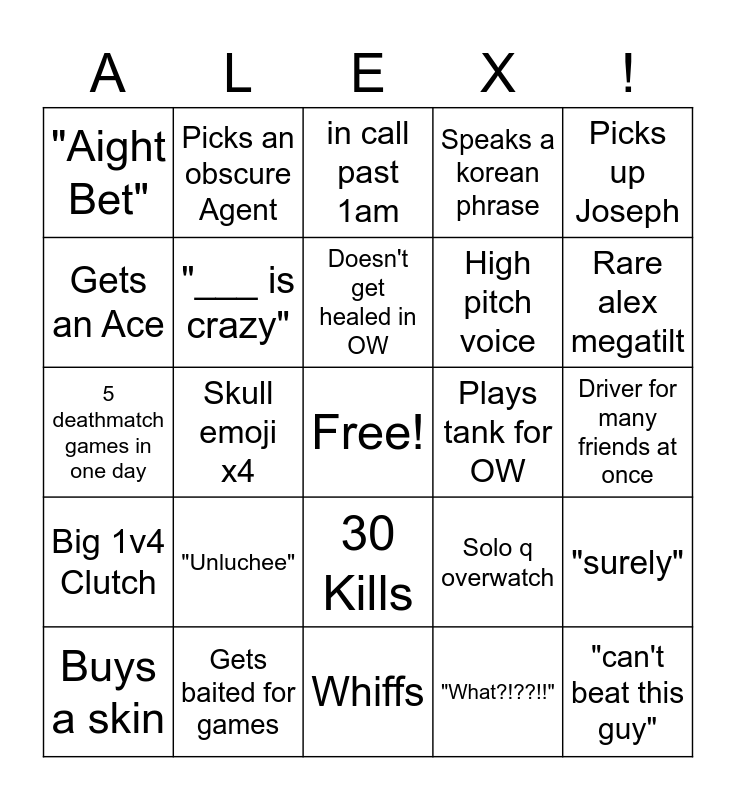 This bingo card has a free space and 24 words: "Unluchee", Gets baited for games, Doesn't get healed in OW, Buys a skin, Picks up Joseph, "Aight Bet", Gets an Ace, Picks an obscure Agent, Plays tank for OW, 30 Kills, High pitch voice, 5 deathmatch games in one day, Solo q overwatch, "surely", "___ is crazy", "What?!??!!", Driver for many friends at once, in call past 1am, Rare alex megatilt, Skull emoji x4, "can't beat this guy", Big 1v4 Clutch, Speaks a korean phrase and Whiffs.