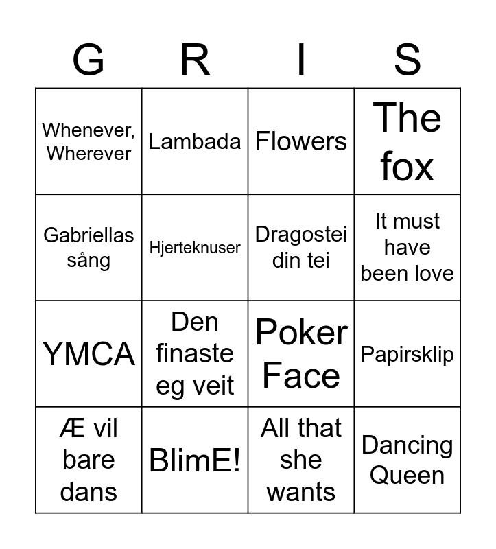 This bingo card has 19 words: Poker Face, Ignite, Flowers, Dancing Queen, Papirsklip, Gabriellas sång, All that she wants, Whenever, Wherever, Lambada, YMCA, Den finaste eg veit, Hjerteknuser, Dragostei din tei, BlimE!, Æ vil bare dans, Sjørøverne kommer, The fox, It must have been love and Let it go.