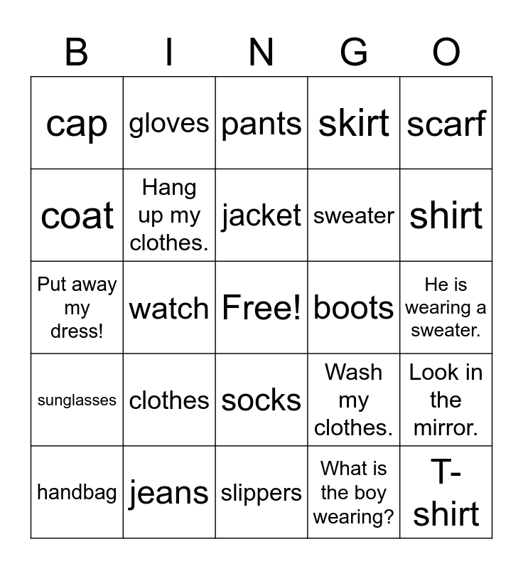 This bingo card has a free space and 24 words: clothes, jeans, jacket, handbag, scarf, cap, coat, gloves, boots, socks, sweater, Put away my dress!, Wash my clothes., Look in the mirror., Hang up my clothes., What is the boy wearing?, He is wearing a sweater., pants, shirt, watch, T-shirt, sunglasses, skirt and slippers.