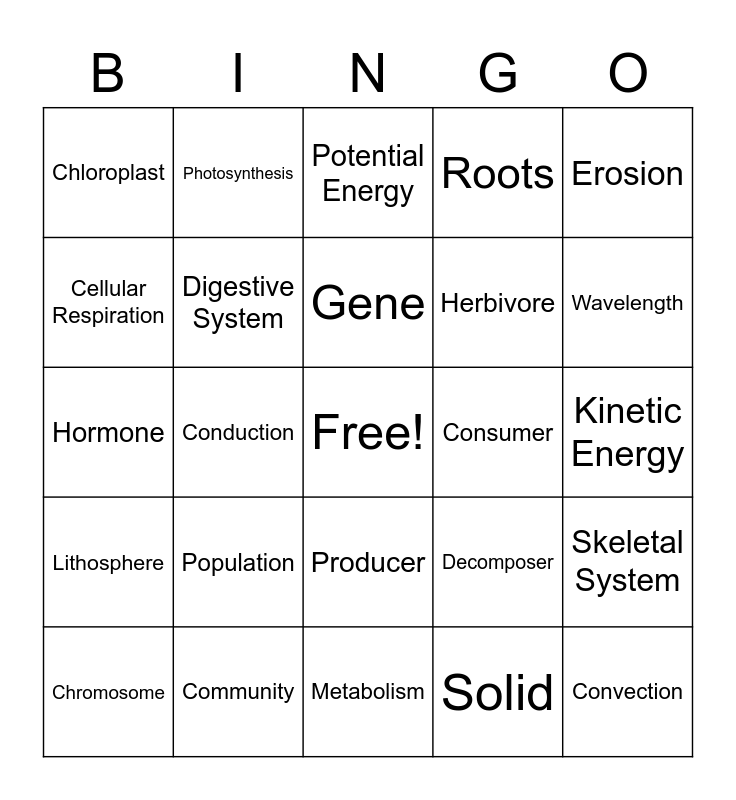 This bingo card has a free space and 24 words: Population, Community, Gene, Chromosome, Erosion, Chloroplast, Cellular Respiration, Photosynthesis, Consumer, Producer, Herbivore, Hormone, Decomposer, Skeletal System, Digestive System, Solid, Kinetic Energy, Potential Energy, Wavelength, Conduction, Convection, Lithosphere, Roots and Metabolism.