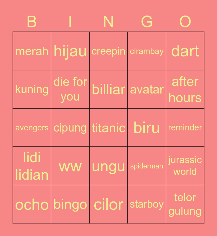 This bingo card has a free space and 24 words: ww, bingo, billiar, ocho, dart, merah, kuning, hijau, biru, ungu, avatar, avengers, spiderman, jurassic world, die for you, starboy, reminder, creepin, after hours, cipung, telor gulung, lidi lidian, cirambay and cilor.