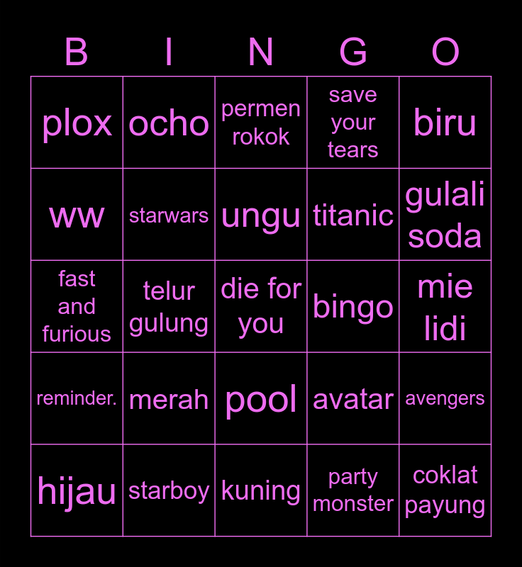This bingo card has 25 words: merah, kuning, ungu, hijau, biru, plox, ww, ocho, bingo, pool, titanic, fast and furious, avatar, avengers, starwars, coklat payung, mie lidi, permen rokok, gulali soda, telur gulung, die for you, starboy, reminder., save your tears and party monster.