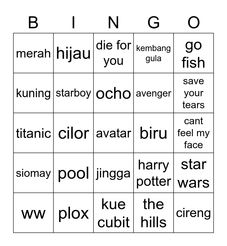 This bingo card has a free space and 24 words: pool, plox, ocho, ww, go fish, merah, kuning, hijau, biru, jingga, avenger, titanic, harry potter, star wars, starboy, the hills, cant feel my face, die for you, save your tears, cilor, cireng, siomay, kembang gula and kue cubit.