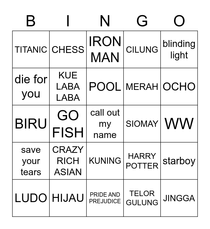 This bingo card has 1 images, a free space and 24 words: LUDO, CRAZY RICH ASIAN, POOL, TELOR GULUNG, OCHO, TITANIC, CHESS, IRON MAN, MERAH, starboy, BIRU, KUE LABA LABA, HARRY POTTER, JINGGA, die for you, HIJAU, PRIDE AND PREJUDICE, CILUNG, WW, save your tears, GO FISH, KUNING, SIOMAY and blinding light.