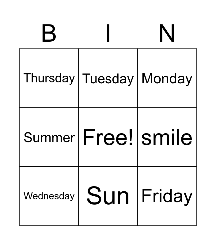 This bingo card has a free space and 8 words: smile, Monday, Tuesday, Wednesday, Thursday, Friday, Summer and Sun.