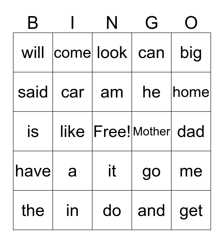 This bingo card has a free space and 24 words: a, in, am, the, big, will, said, come, Mother, it, he, is, go, me, car, and, dad, look, home, like, get, have, can and do.