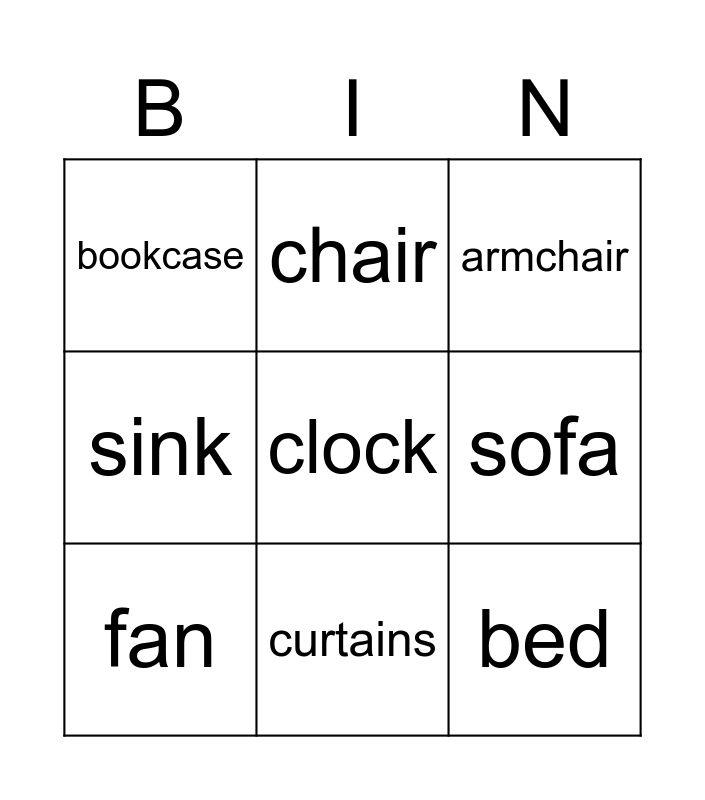 This bingo card has 27 words: Free!, television, bed, fridge, sofa, armchair, chair, table, lamp, bath, toilet, sink, shower, wardrobe, mirror, cupboard, fan, curtains, rug, bookcase, desk, cooker, door, shelf, drawers, clock and window.