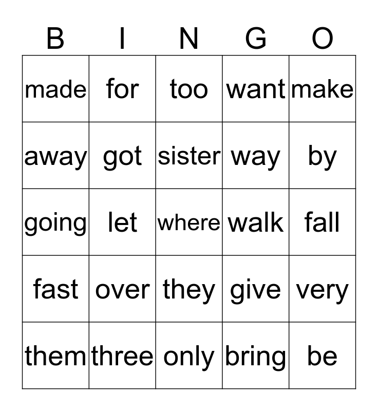This bingo card has a free space and 24 words: over, three, sister, them, make, made, away, for, walk, they, way, going, give, very, got, bring, fall, too, by, let, be, fast, want and only.