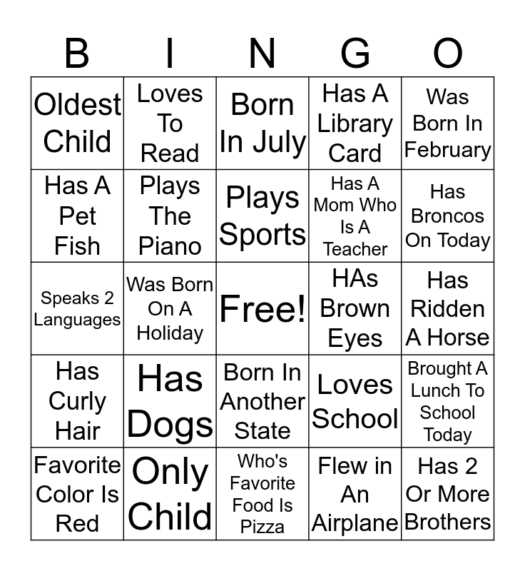 This bingo card has a free space and 24 words: Has Dogs, Only Child, Plays Sports, Favorite Color Is Red, Was Born In February, Oldest Child, Has A Pet Fish, Loves To Read, HAs Brown Eyes, Born In Another State, Has A Mom Who Is A Teacher, Speaks 2 Languages, Loves School, Brought A Lunch To School Today, Plays The Piano, Flew in An Airplane, Has Ridden A Horse, Born In July, Has Broncos On Today, Was Born On A Holiday, Has 2 Or More Brothers, Has Curly Hair, Has A Library Card and Who's Favorite Food Is Pizza.