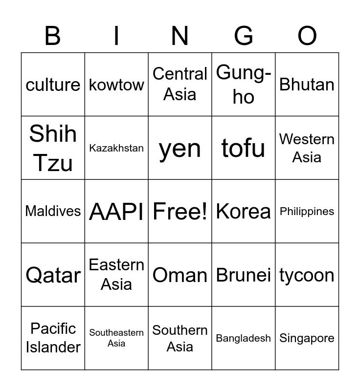 This bingo card has a free space and 29 words: Pacific Islander, Asian American, AAPI, Oceania, culture, Central Asia, Kazakhstan, Eastern Asia, Korea, Southeastern Asia, Philippines, Singapore, Southern Asia, Bangladesh, Western Asia, Azerbaijan, Oman, Qatar, Bhutan, Maldives, Brunei, ketchup, tofu, Shih Tzu, Gung-ho, kowtow, tycoon, yen and yin and yang.