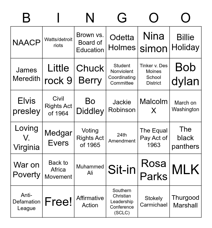 This bingo card has 38 words: MLK, Rosa Parks, Thurgood Marshall, James Meredith, Medgar Evers, Malcolm X, Little rock 9, Stokely Carmichael, Nina simon, Chuck Berry, Bob dylan, Odetta Holmes, Elvis presley, Bo Diddley, Billie Holiday, Jackie Robinson, Muhammed Ali, Brown vs. Board of Education, Free!, Civil Rights Act of 1964, NAACP, 24th Amendment, Student Nonviolent Coordinating Committee, Voting Rights Act of 1965, Affirmative Action, The Equal Pay Act of 1963, War on Poverty, Southern Christian Leadership Conference (SCLC), Anti-Defamation League, Sit-in, Freedom ride/summer, March on Washington, The black panthers, Watts/detroit riots, Back to Africa Movement, Loving V. Virginia, Tinker v. Des Moines School District and Jack Johnson.