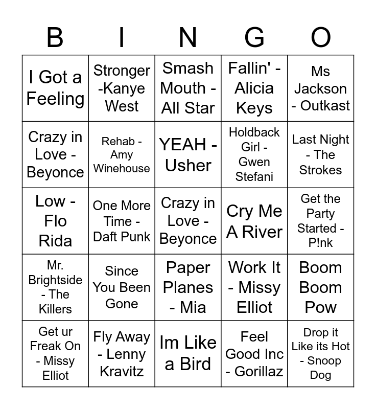 This bingo card has a free space and 24 words: Since You Been Gone, Fly Away - Lenny Kravitz, YEAH - Usher, Get ur Freak On - Missy Elliot, Ms Jackson - Outkast, I Got a Feeling, Crazy in Love - Beyonce, Stronger -Kanye West, Cry Me A River, Paper Planes - Mia, Holdback Girl - Gwen Stefani, Low - Flo Rida, Work It - Missy Elliot, Boom Boom Pow, Rehab - Amy Winehouse, Feel Good Inc - Gorillaz, Get the Party Started - P!nk, Smash Mouth - All Star, Last Night - The Strokes, One More Time - Daft Punk, Drop it Like its Hot - Snoop Dog, Mr. Brightside - The Killers, Fallin' - Alicia Keys and Im Like a Bird.