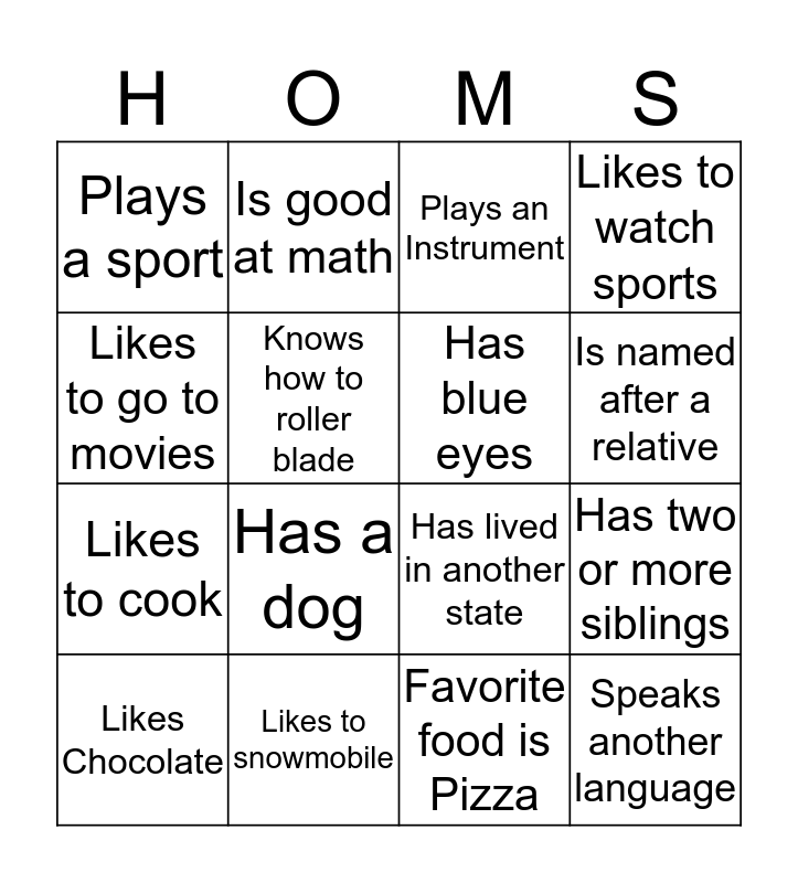 This bingo card has a free space and 15 words: Likes Chocolate, Speaks another language, Plays an Instrument, Plays a sport, Is named after a relative, Likes to go to movies, Has a dog, Favorite food is Pizza, Knows how to roller blade, Likes to cook, Has two or more siblings, Likes to watch sports, Has blue eyes, Is good at math and Likes to snowmobile.