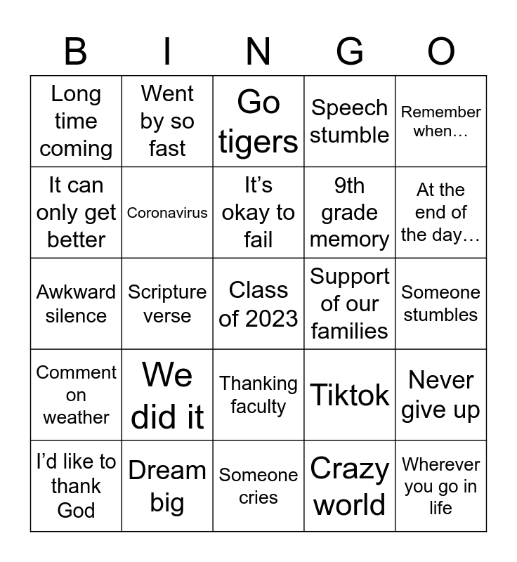 This bingo card has a free space and 24 words: We did it, Dream big, It’s okay to fail, I’d like to thank God, Remember when…, Long time coming, It can only get better, Went by so fast, Support of our families, Thanking faculty, 9th grade memory, Awkward silence, Tiktok, Never give up, Coronavirus, Crazy world, Someone stumbles, Go tigers, At the end of the day…, Scripture verse, Wherever you go in life, Comment on weather, Speech stumble and Someone cries.