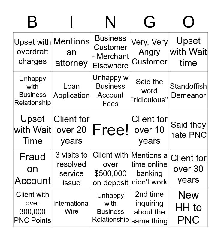 This bingo card has a free space and 24 words: 3 visits to resolved service issue, International Wire, Unhappy w Business Account Fees, Client with over 300,000 PNC Points, Upset with Wait time, Upset with overdraft charges, Unhappy with Business Relationship, Mentions an attorney, Client for over 10 years, Client with over $500,000 on deposit, Said the word "ridiculous", Upset with Wait Time, Mentions a time online banking didn't work, Client for over 30 years, Loan Application, 2nd time inquiring about the same thing, Said they hate PNC, Business Customer - Merchant Elsewhere, Standoffish Demeanor, Client for over 20 years, New HH to PNC, Fraud on Account, Very, Very Angry Customer and Unhappy with Business Relationship.