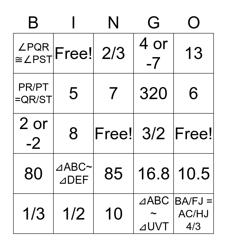 This bingo card has a free space and 24 words: ⊿ABC~ ⊿DEF, 1/2, 7, 1/3, 13, ∠PQR ≅∠PST, PR/PT =QR/ST, Free!, 3/2, 85, 320, 2 or -2, 16.8, 10.5, 5, ⊿ABC ~ ⊿UVT, Free!, 2/3, 6, 8, BA/FJ = AC/HJ 4/3, 80, 4 or -7 and 10.